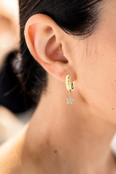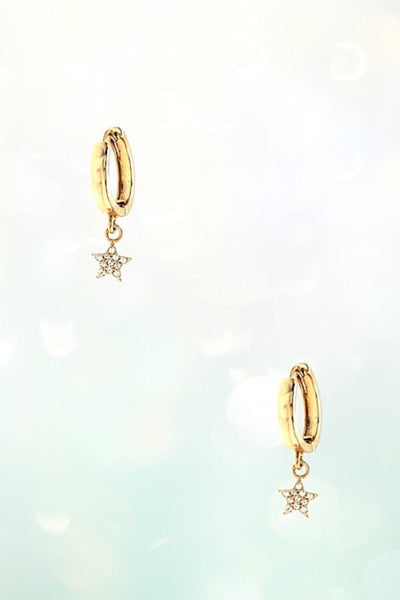 RHINESTONE PAVE STAR DANGLE MINI HOOP EARRINGAPPROX TOTAL SIZE: 1\"Product color and quality as seen on a monitor may vary slightly compared to actual items due to photography lighting conditions and individual screen color calibration.