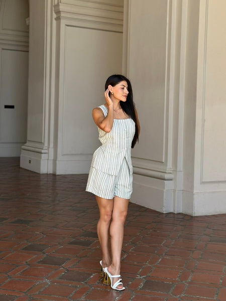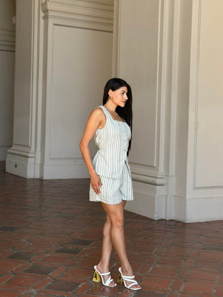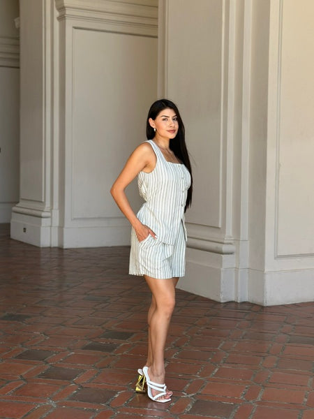 Linen Stripe Pocketed Shorts and Button-Down Vest Set