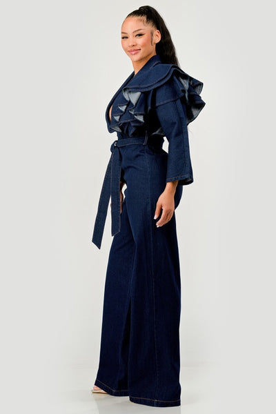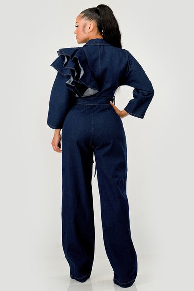 Dark Denim Ruffle Shoulder Jumpsuit