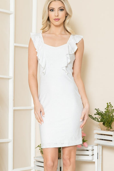 Stretch eyelet fabric with full liningRuffle sleeves Model is 5'8 wearing size XS