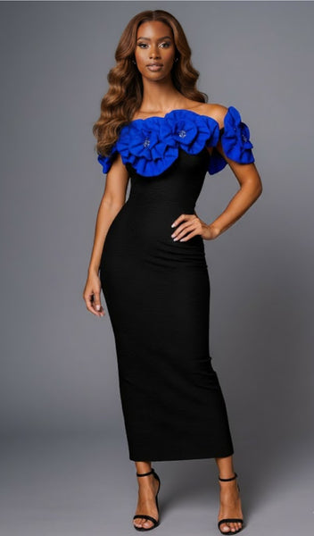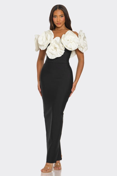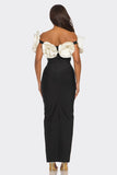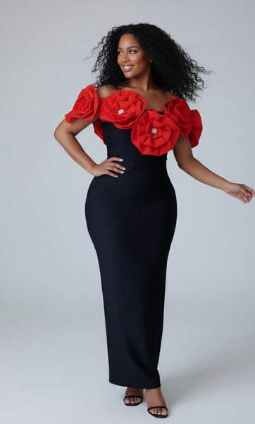 A dramatic black evening gown with oversized floral appliques cascading across the chest and shoulders. The structured flowers add an artistic, high-fashion touch to the minimalist silhouette, while the sleek, fitted design ensures a refined look. Perfect for making a memorable statement at any black-tie event.