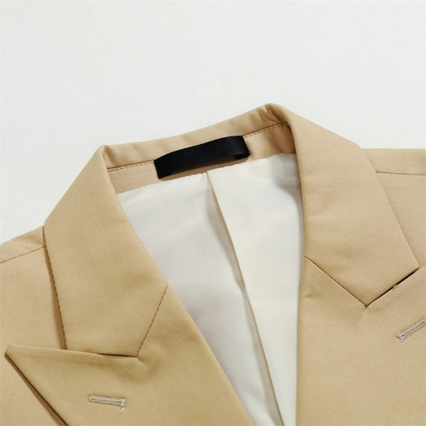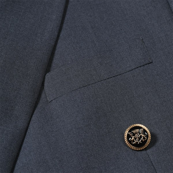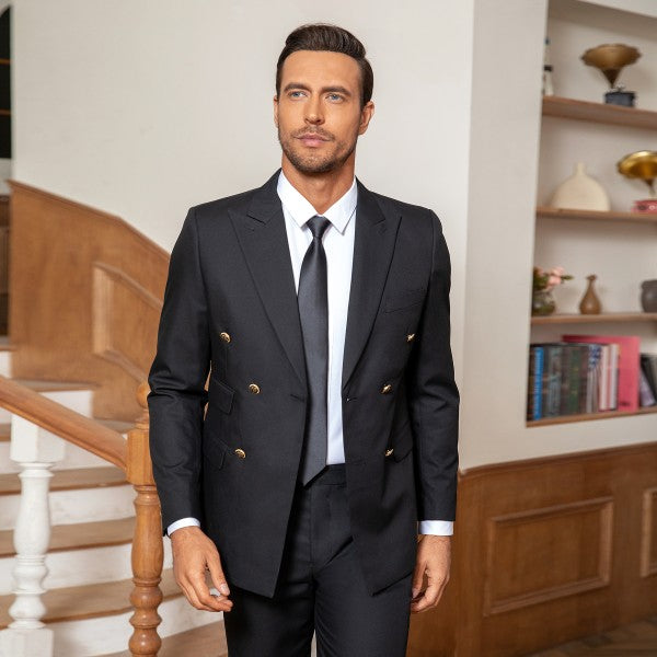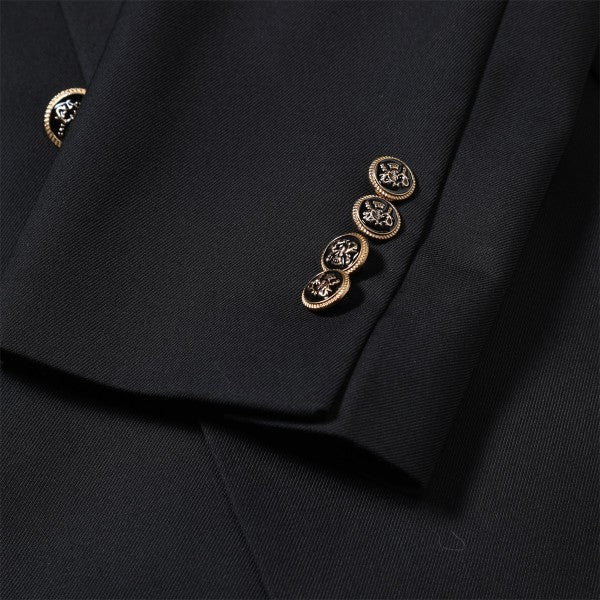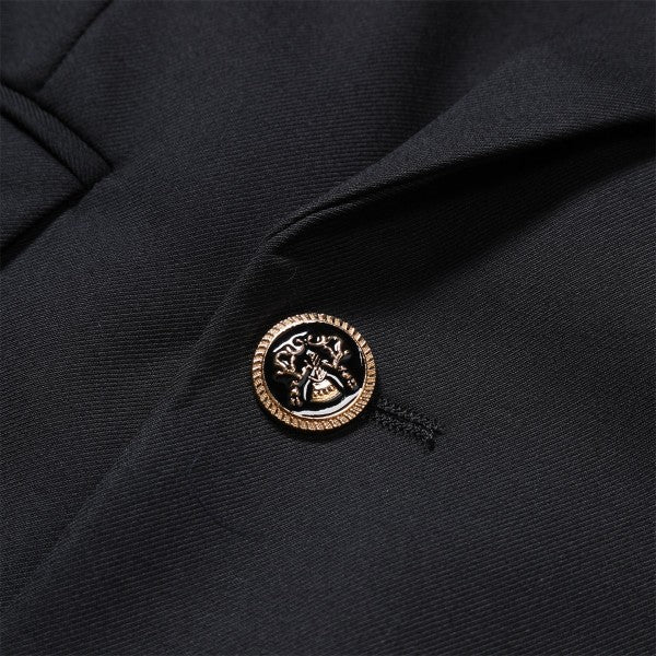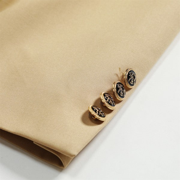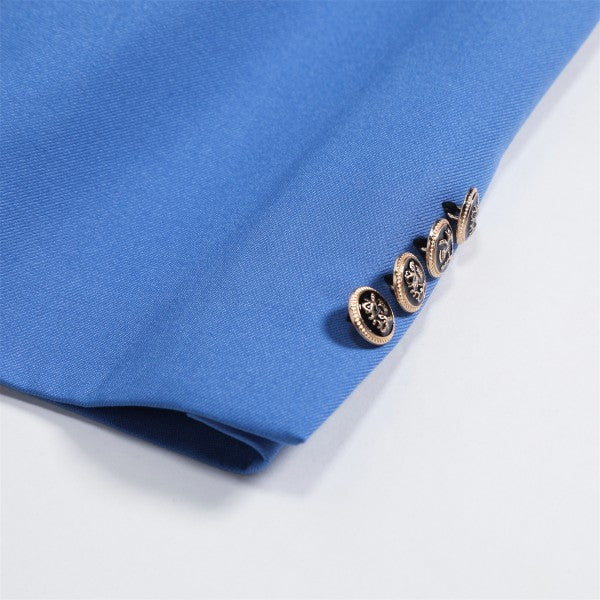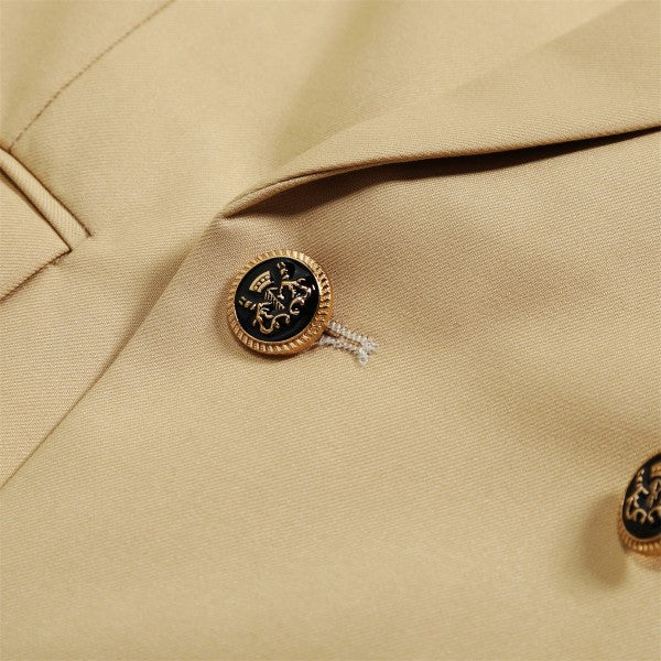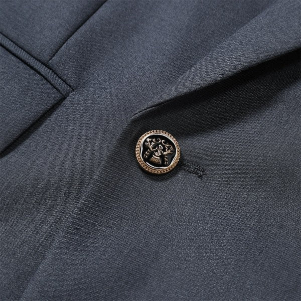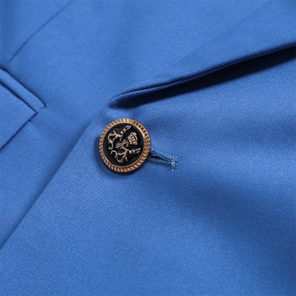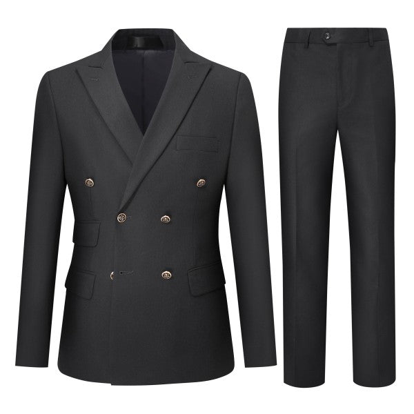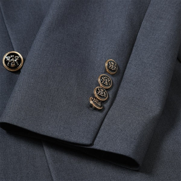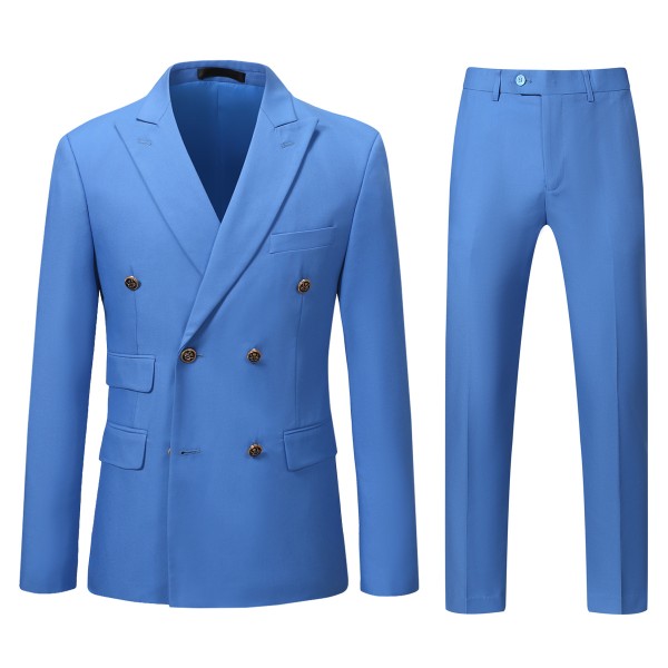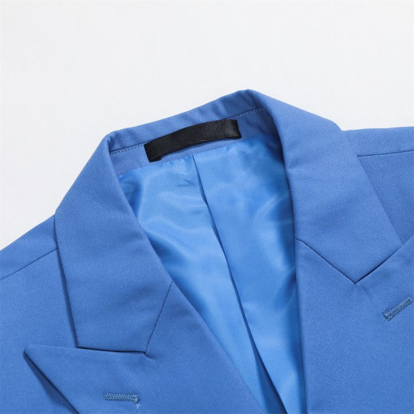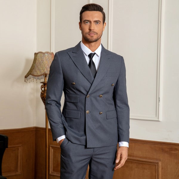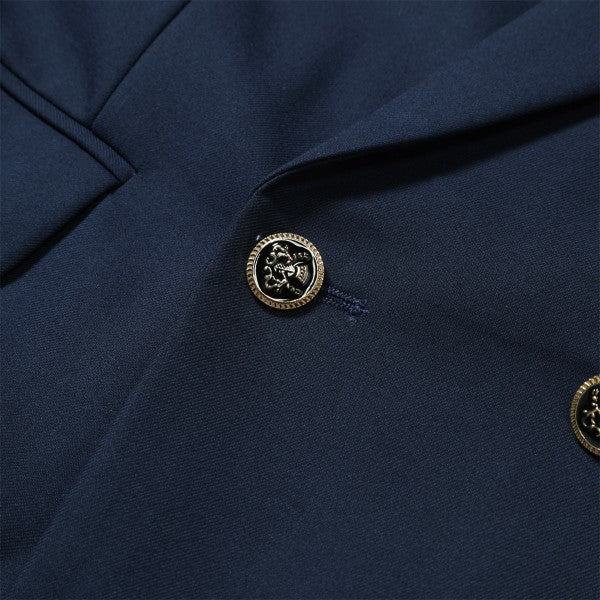 This solid blazer features peaked lapels, double-breasted with two-button closure, four-button cuffs, a decorative chest pocket, 3 utility flap pockets, attached lining with two built-in pockets, these pants features two slant pockets, two button-closure back pockets.