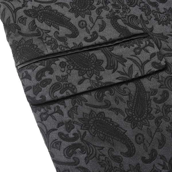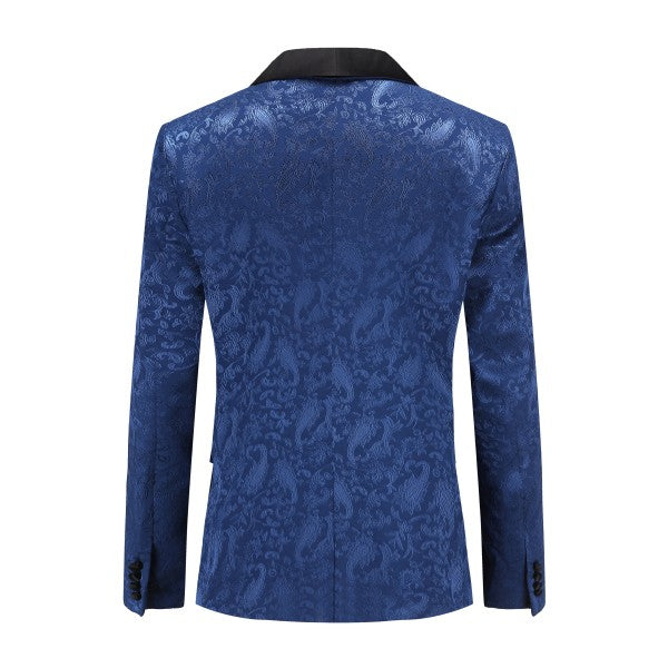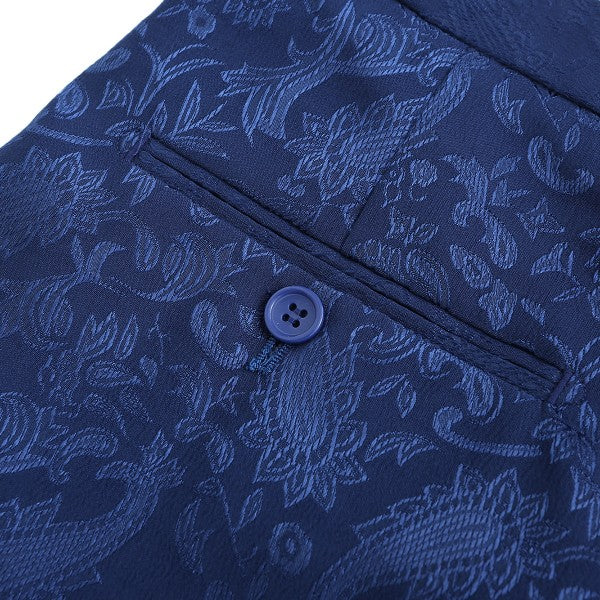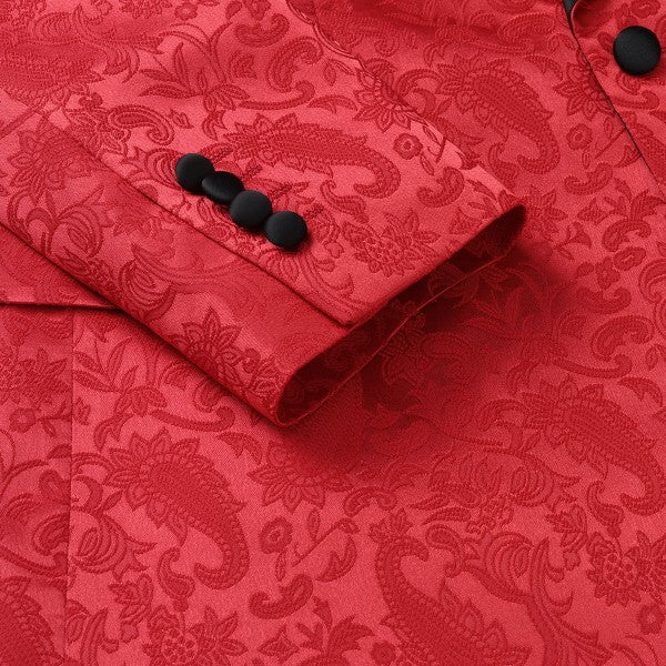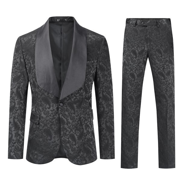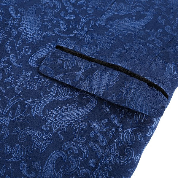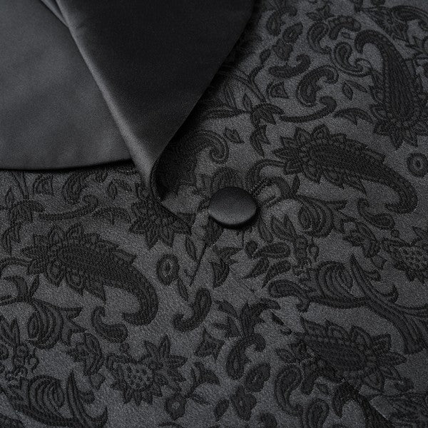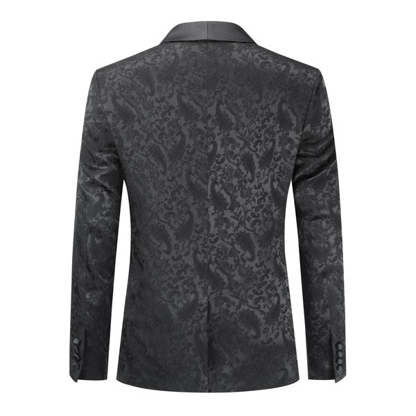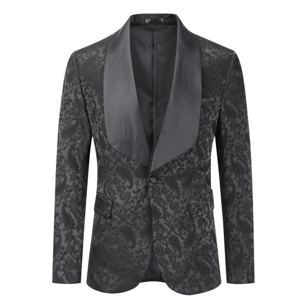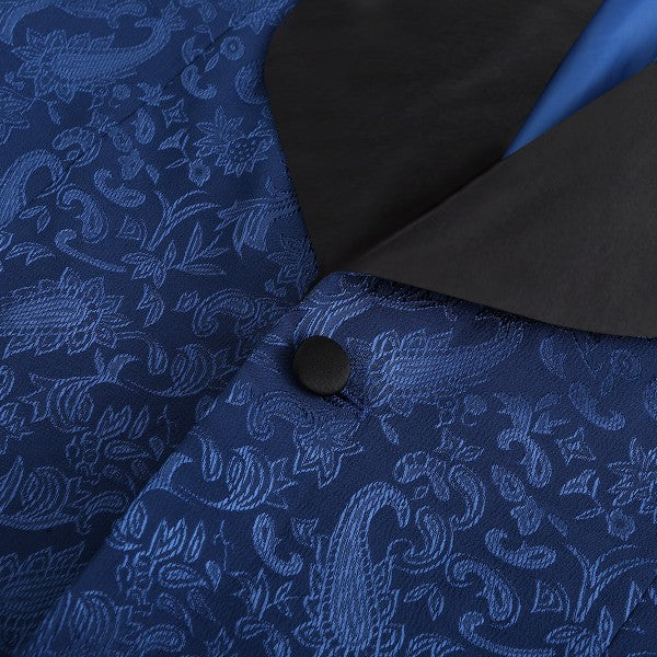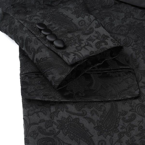 Paisley style with a black shawl lapel, single-button closure, and single-breasted silhouette, perfect for formal occasions. The chest pocket fits a pocket square, and you can pair it with a bow tie or breastpin. Shoulder pads ensure the suit keeps its shape.