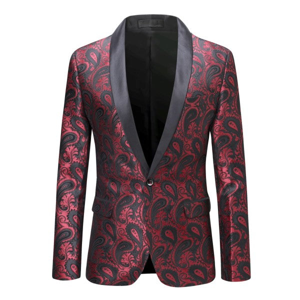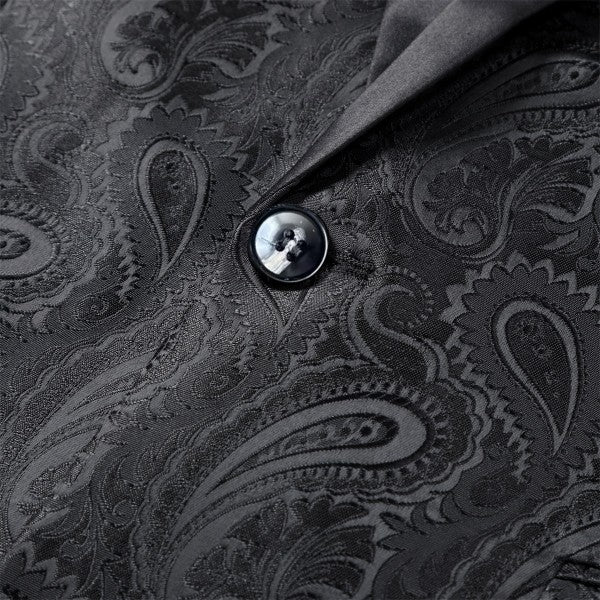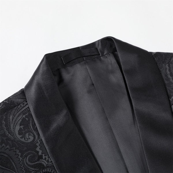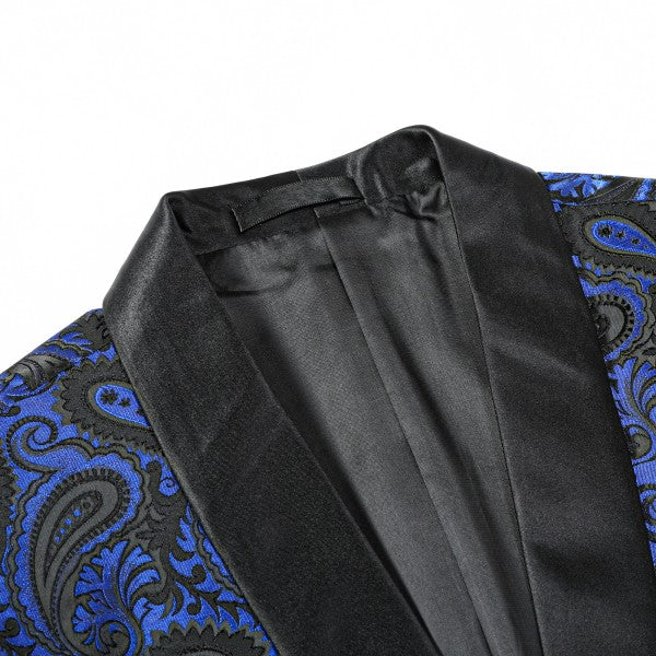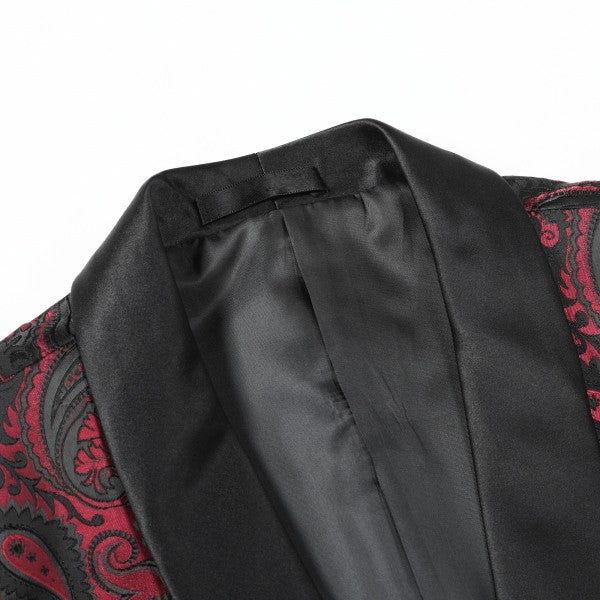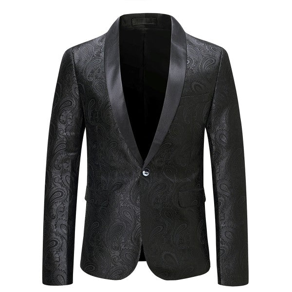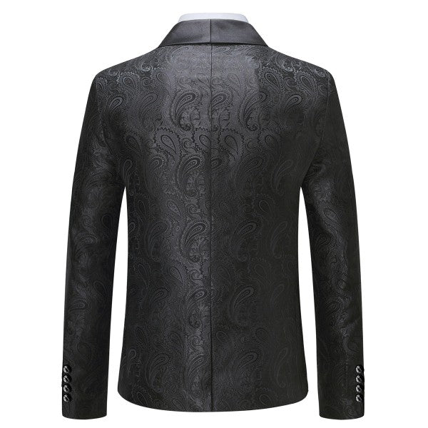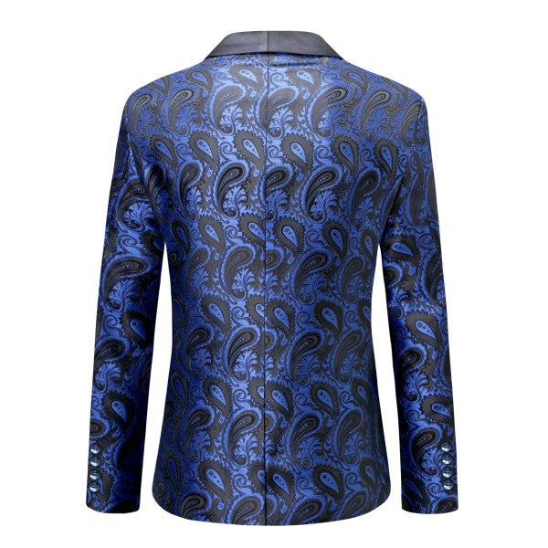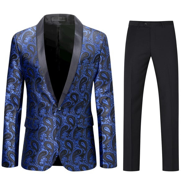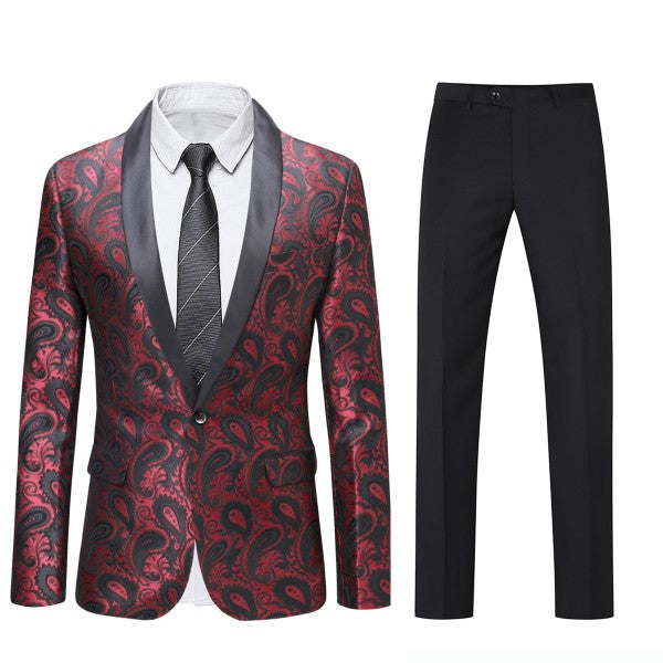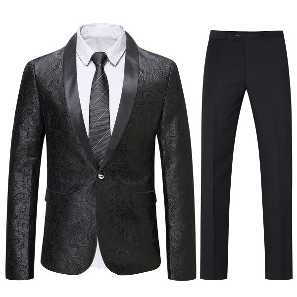 Top - Elegant suit blazer with black shawl collar, center vent, one chest pocket, two inner pockets and two side flap pockets, featuring exquisite floral print, 3D tailored fit cut and full shoulder design, overall nice expressing a sharp looking, Bottom - Flat front trousers with two side slant pockets and two back pockets.