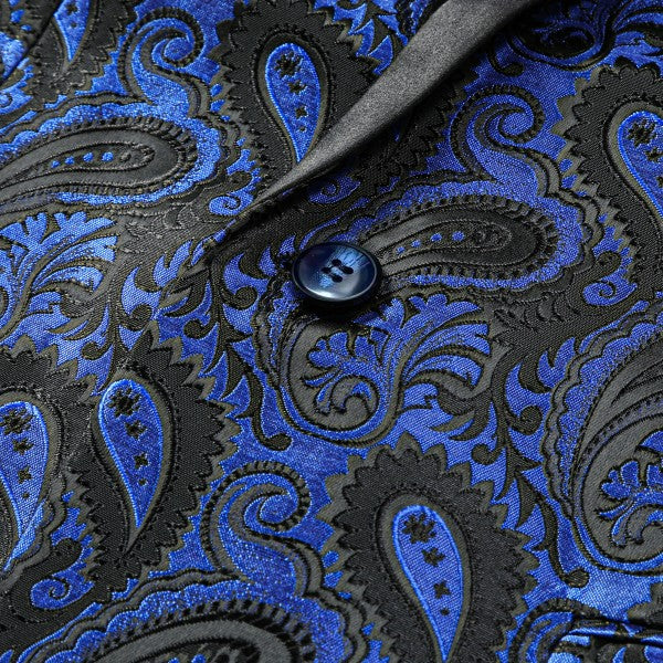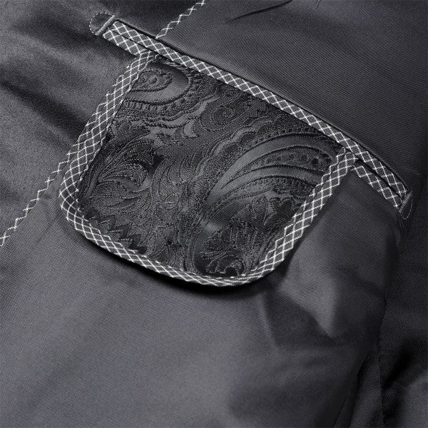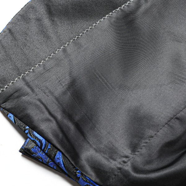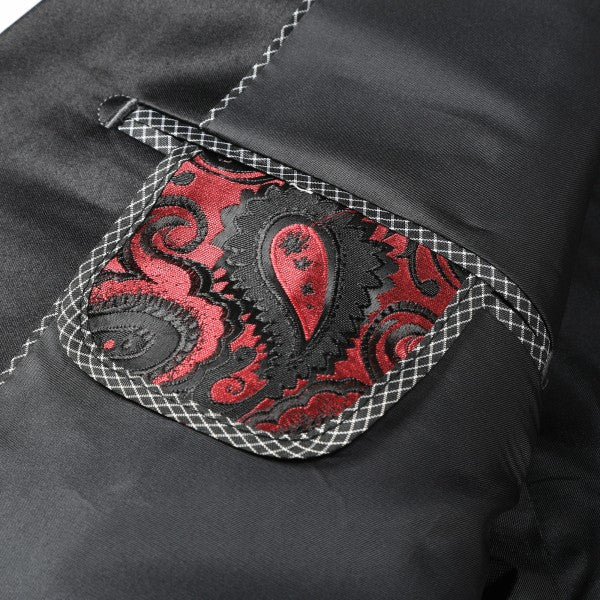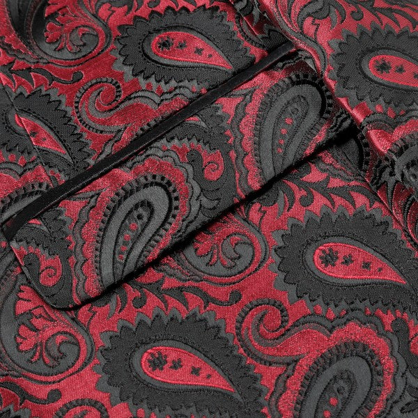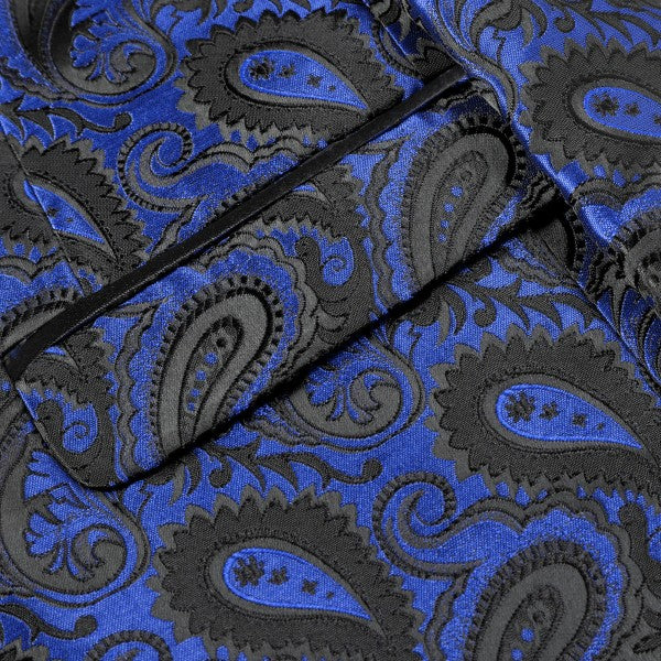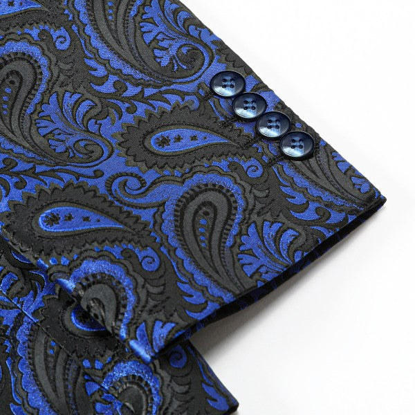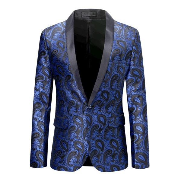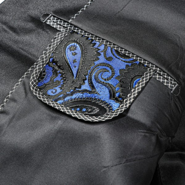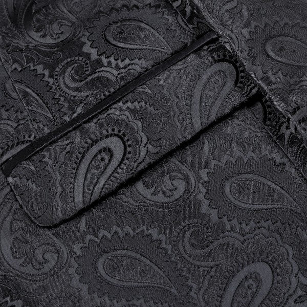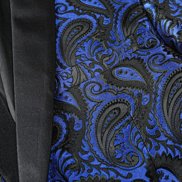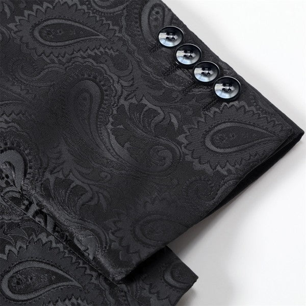 Top - Elegant suit blazer with black shawl collar, center vent, one chest pocket, two inner pockets and two side flap pockets, featuring exquisite floral print, 3D tailored fit cut and full shoulder design, overall nice expressing a sharp looking, Bottom - Flat front trousers with two side slant pockets and two back pockets.