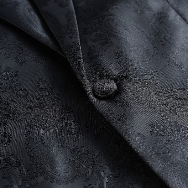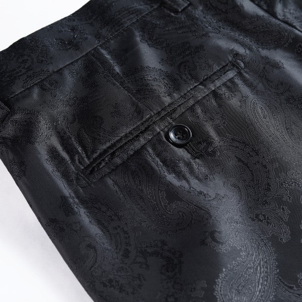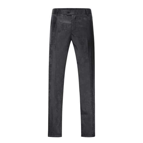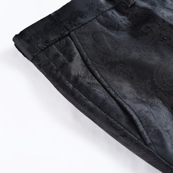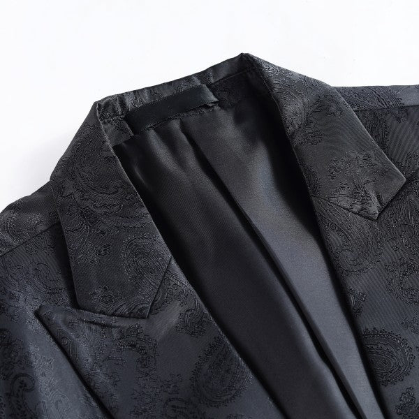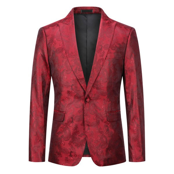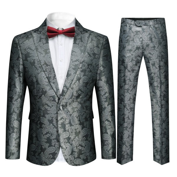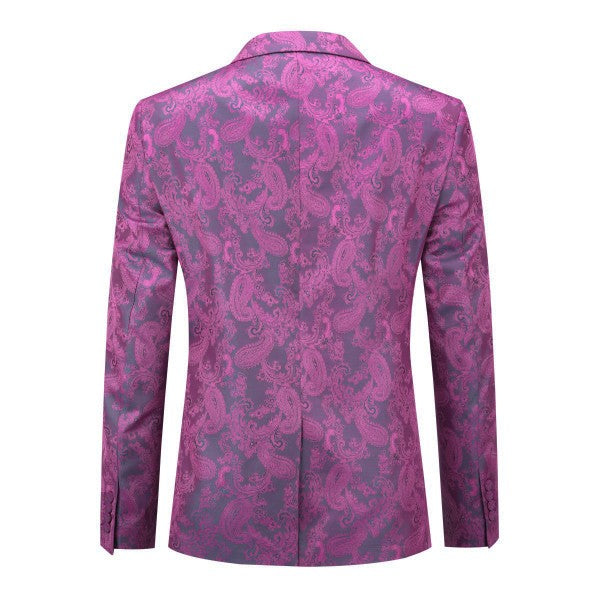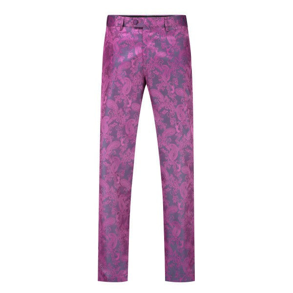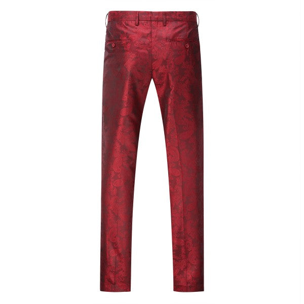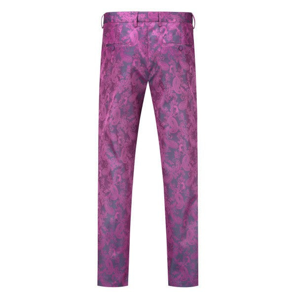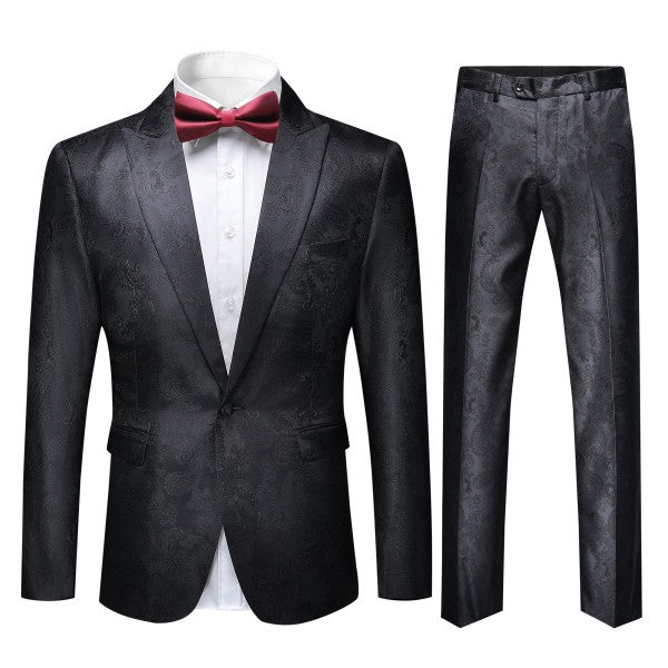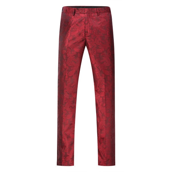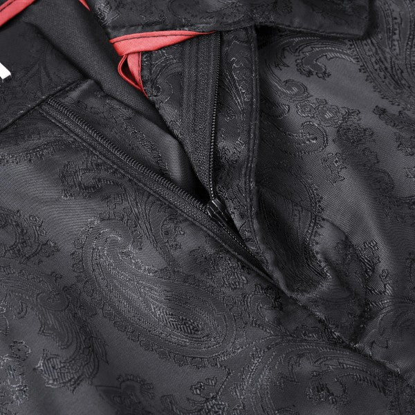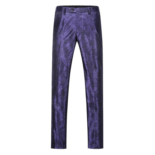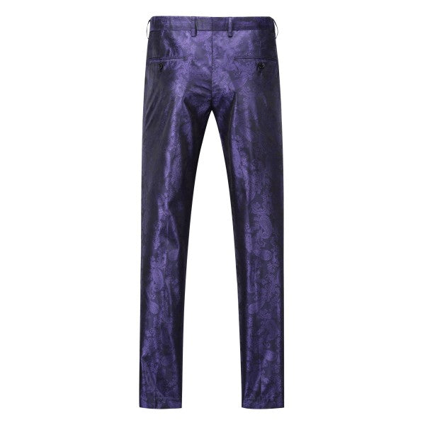Top - single breasted, one button, notched lapel, center vent, two flap pockets, four cuff buttons. Bottom - flat front pants with slanted side pockets. Paisley pattern, colors Black/Burgundy/Purple available.