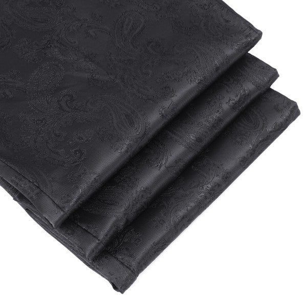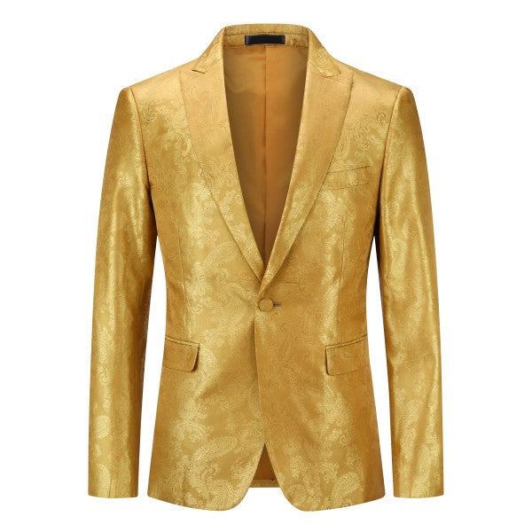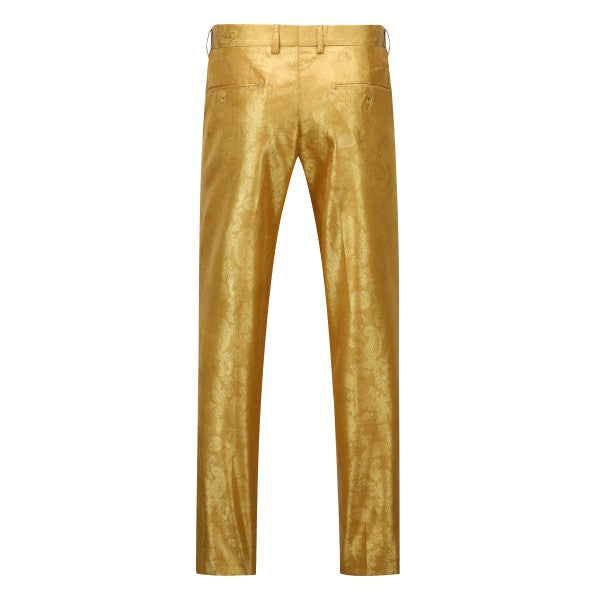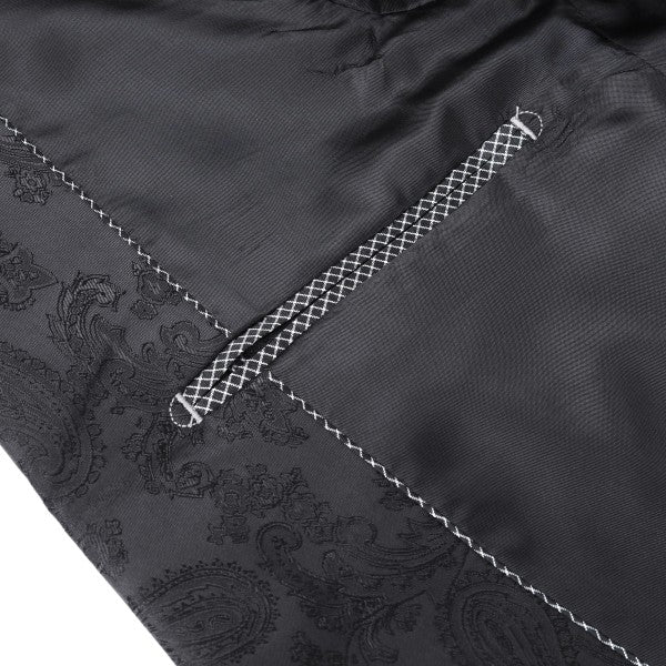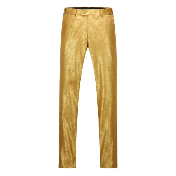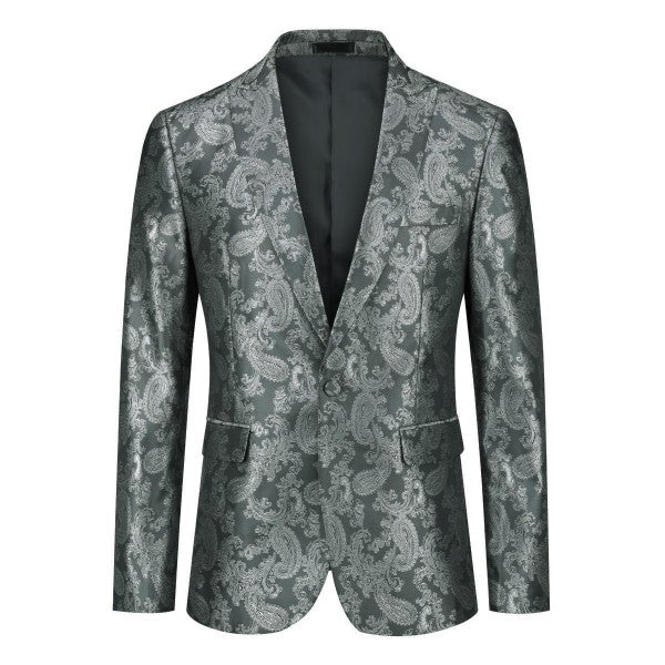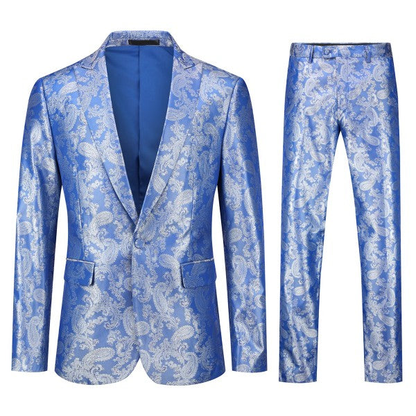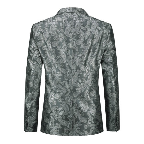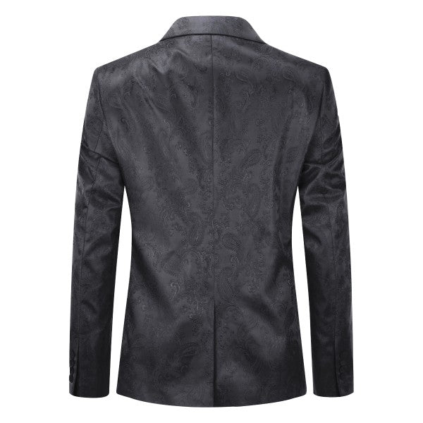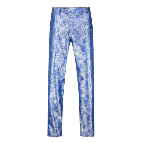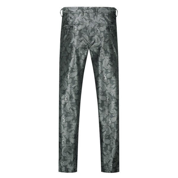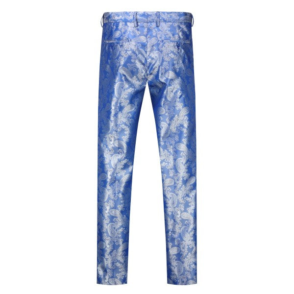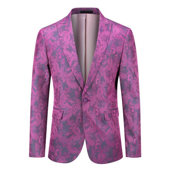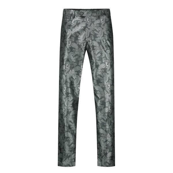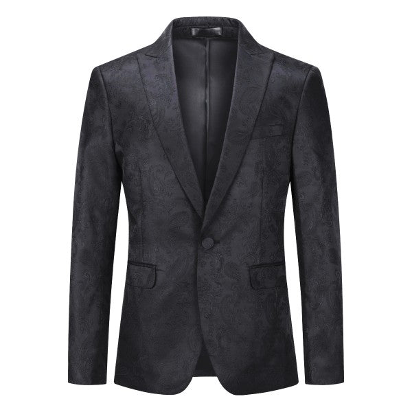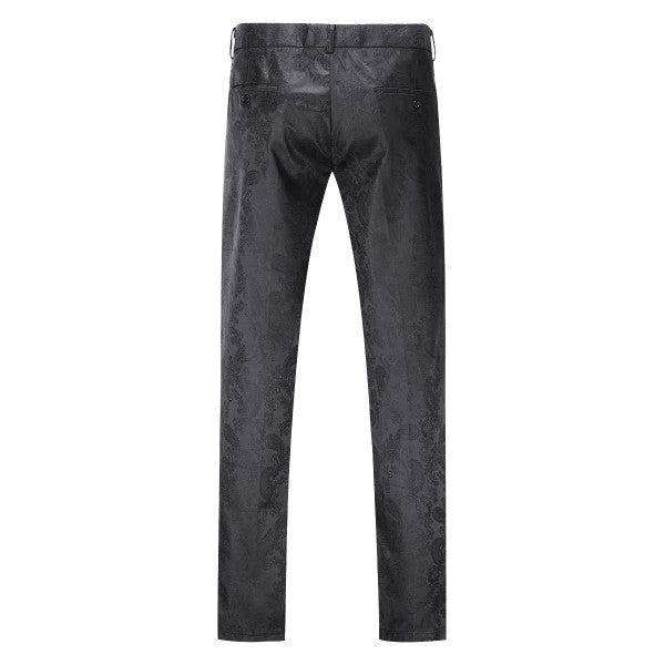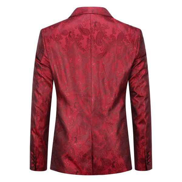 Top - single breasted, one button, notched lapel, center vent, two flap pockets, four cuff buttons. Bottom - flat front pants with slanted side pockets. Paisley pattern, colors Black/Burgundy/Purple available.