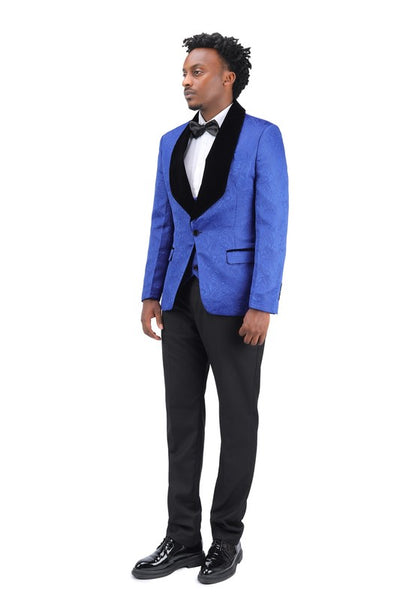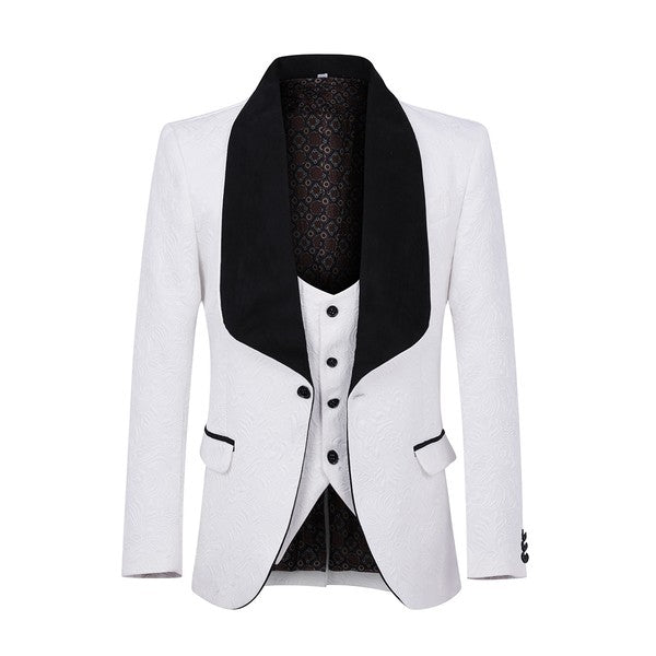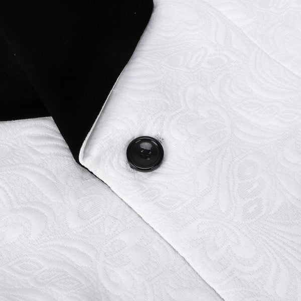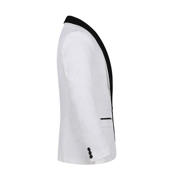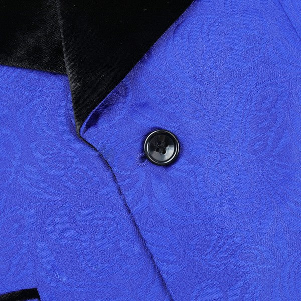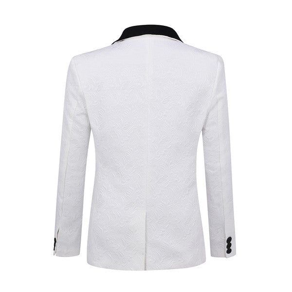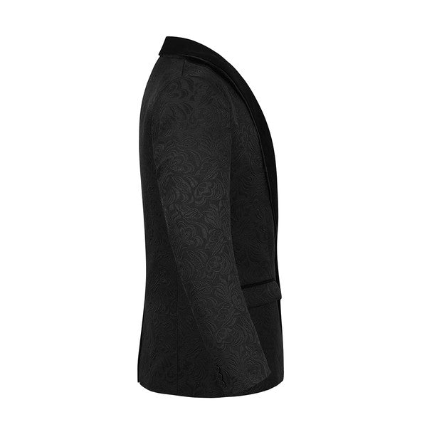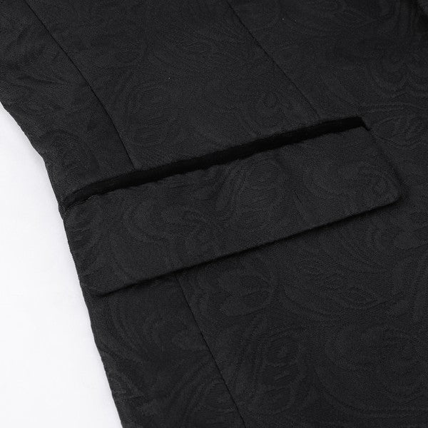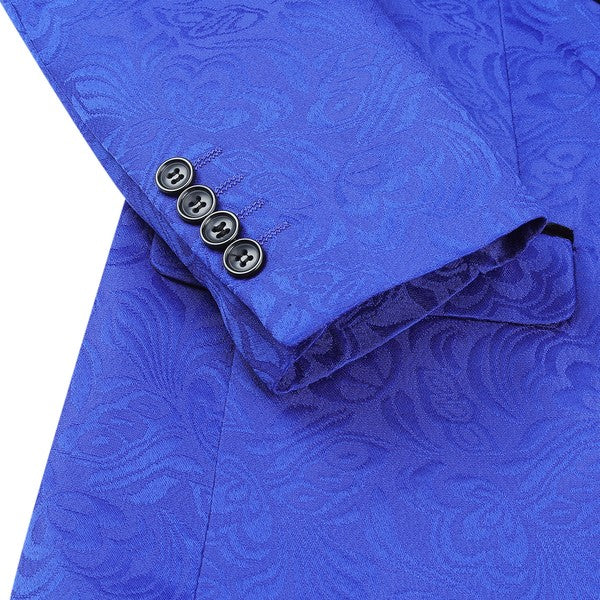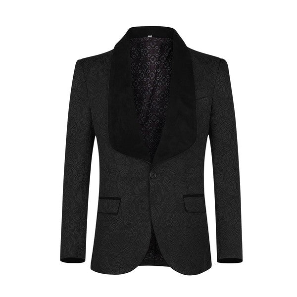 shawl collar, jacquard, single breasted,one button down closure,upscale button and cut with 3D draping.the slim fit style makes you look modern and sharp.there are 3 pockets outside,1 chest pocket,2 flap pockets,and 1 real pocket inside.