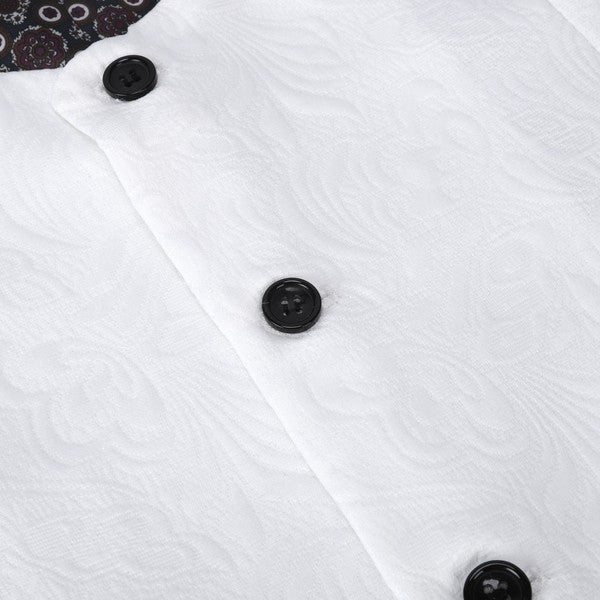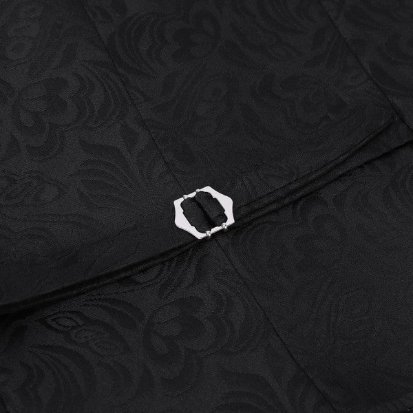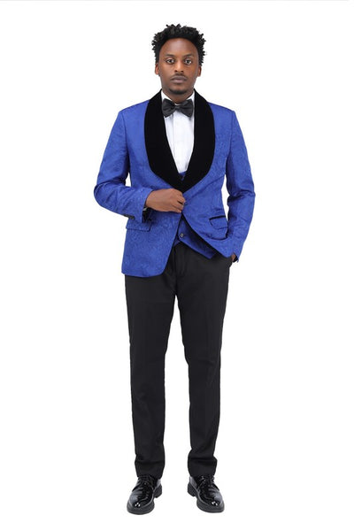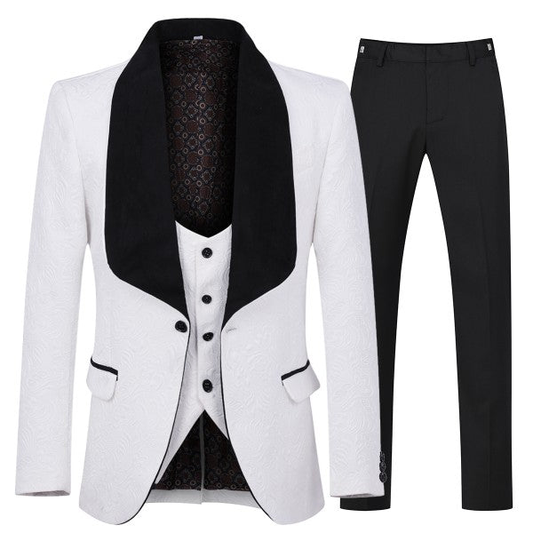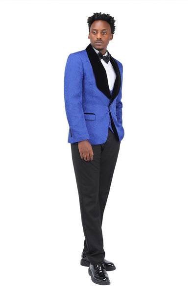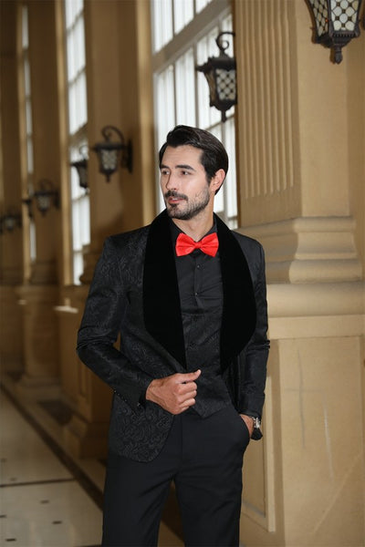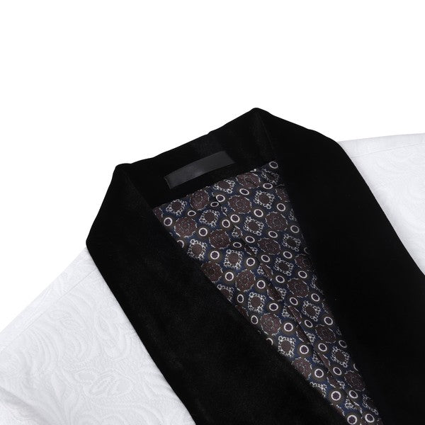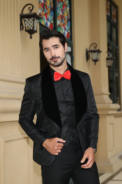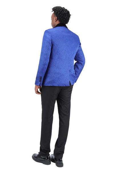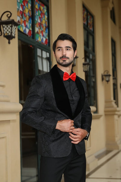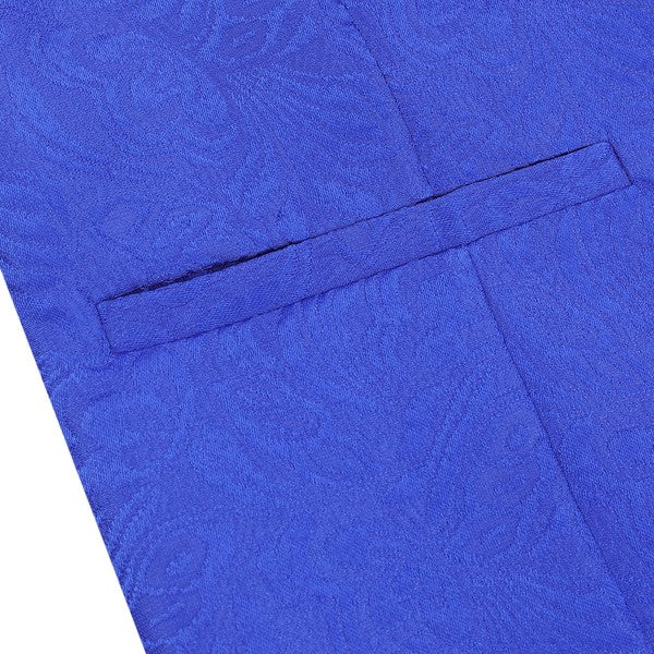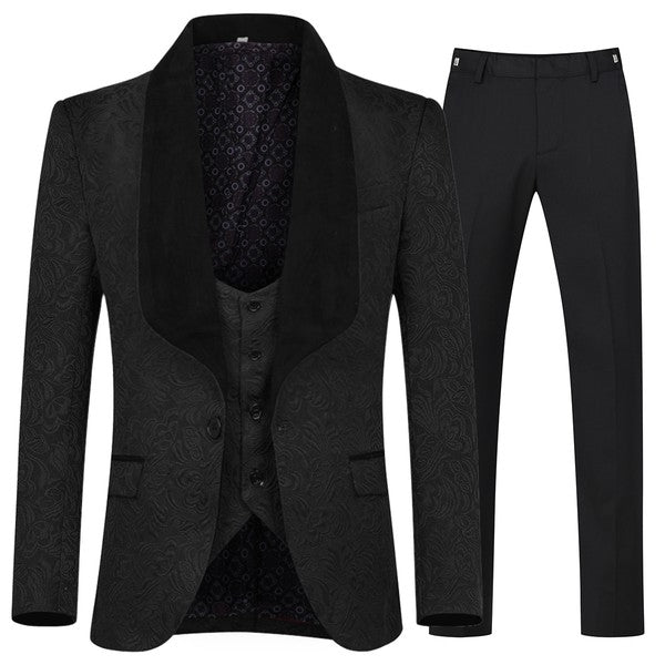 shawl collar, jacquard, single breasted,one button down closure,upscale button and cut with 3D draping.the slim fit style makes you look modern and sharp.there are 3 pockets outside,1 chest pocket,2 flap pockets,and 1 real pocket inside.