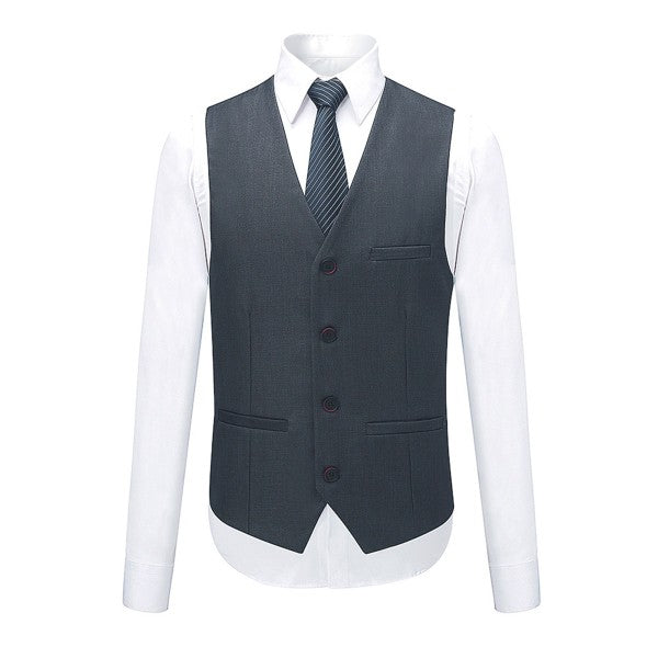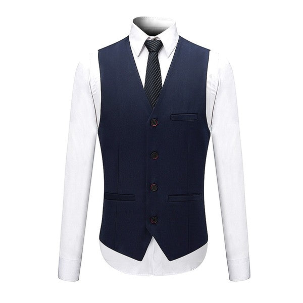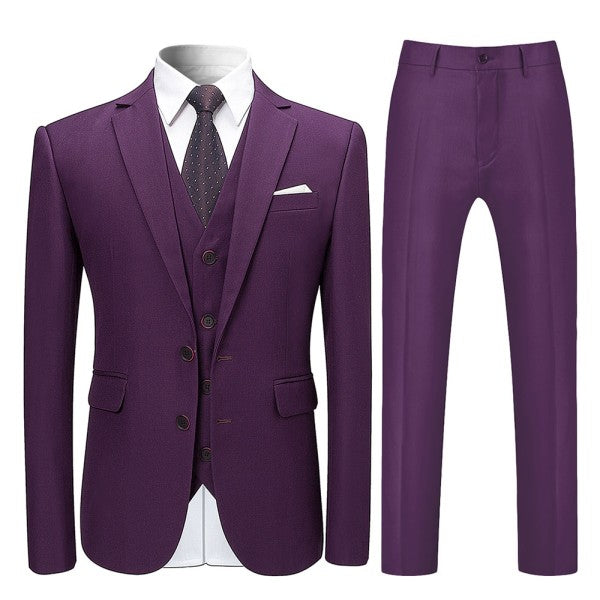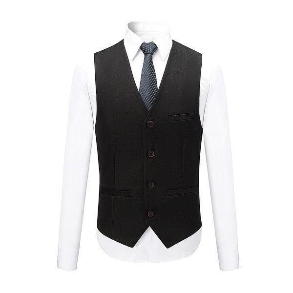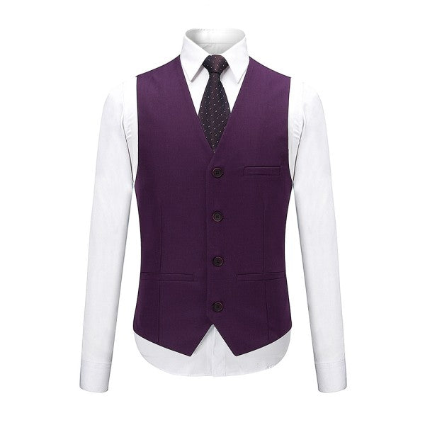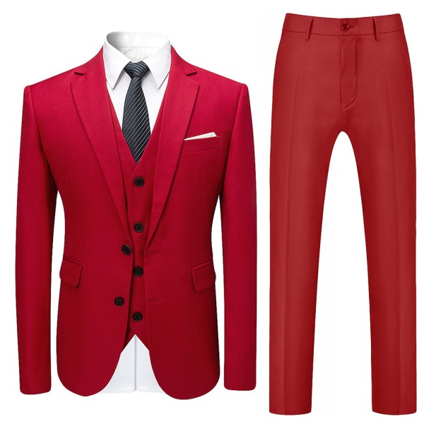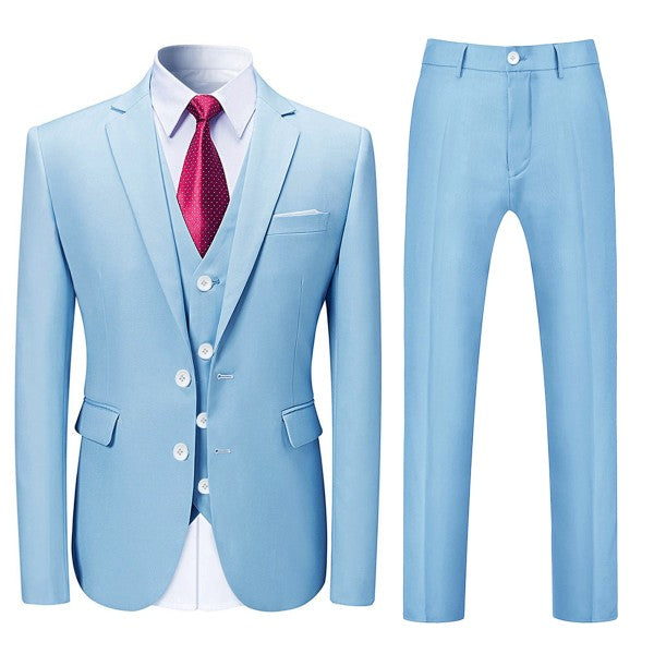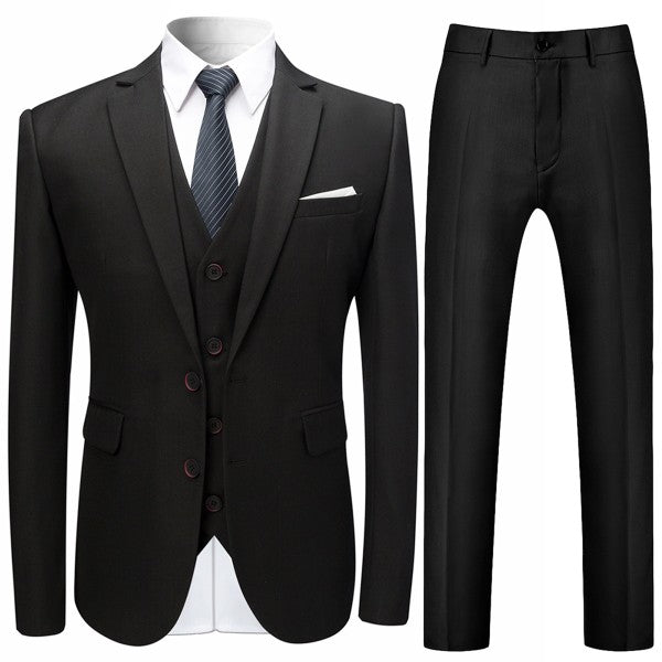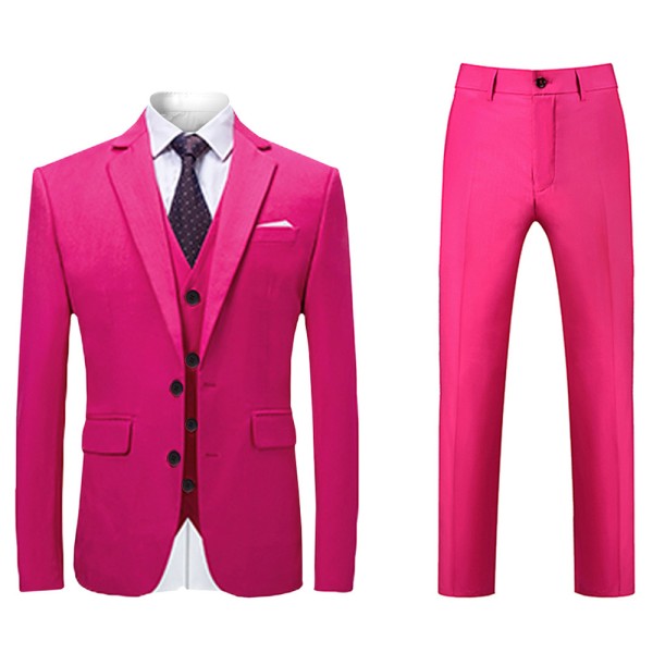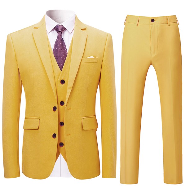 This mens 3-piece suit set features 2 button closure, notched lapels, single-breasted, 2 utility flap pockets, 1 chest pocket, 2 inner pockets, 4-button cuffs, V-neck vest, pleated-front pants.