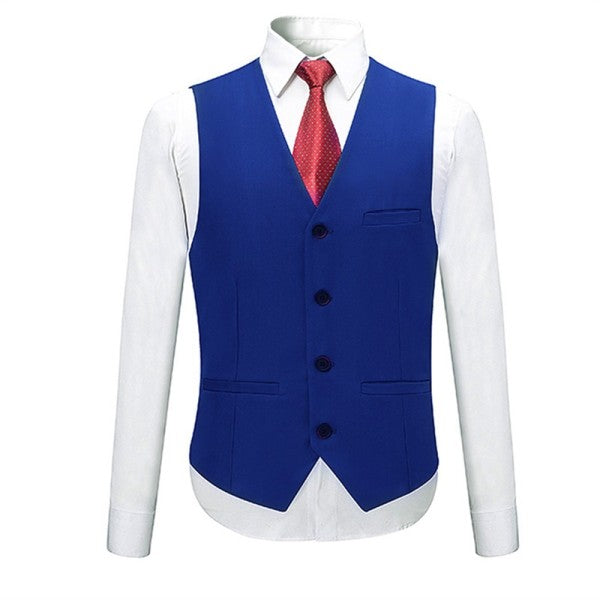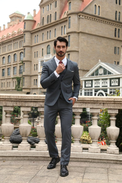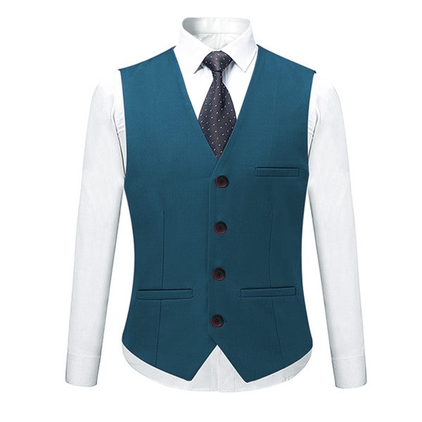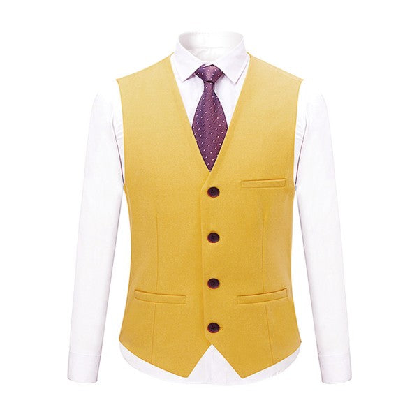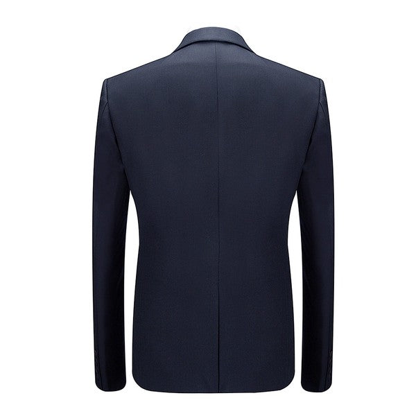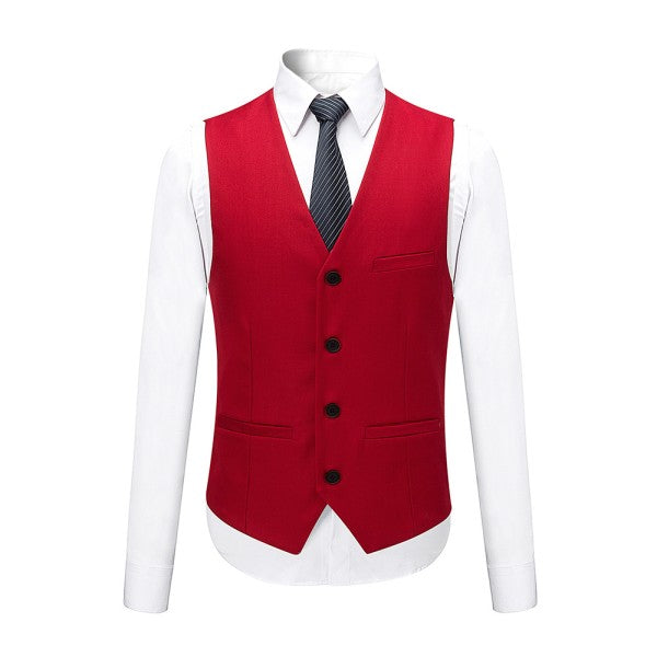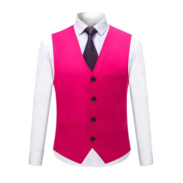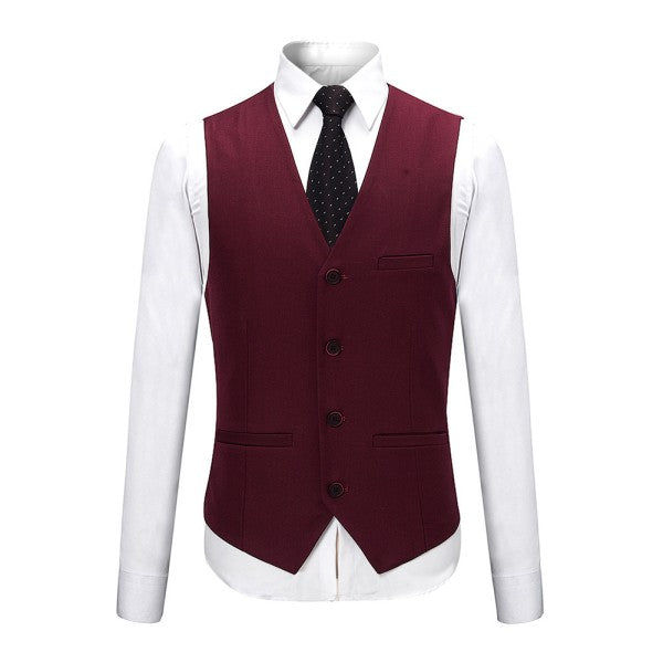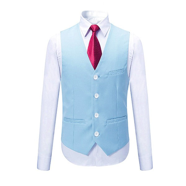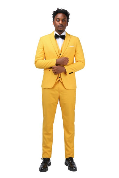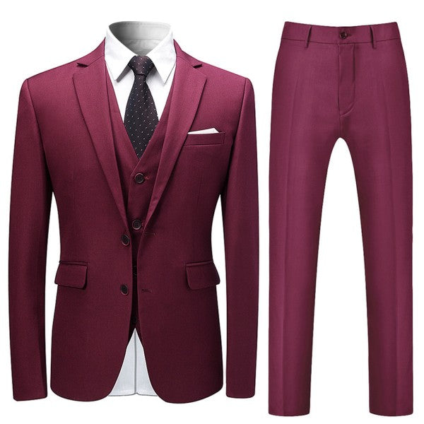 This mens 3-piece suit set features 2 button closure, notched lapels, single-breasted, 2 utility flap pockets, 1 chest pocket, 2 inner pockets, 4-button cuffs, V-neck vest, pleated-front pants.