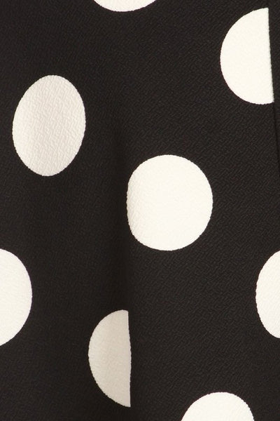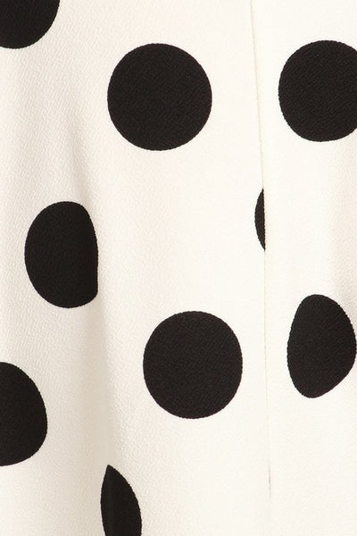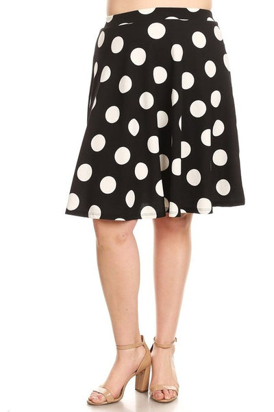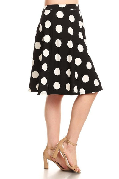 Polka dot printed, high waisted knee length skirt with an a-line silhouette and elastic waistband.