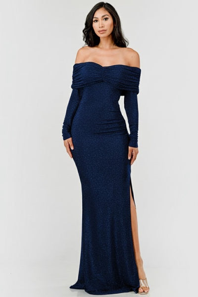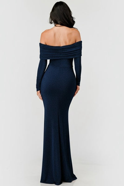 Neckline & Sleeves: Features a beautiful, flattering off-the-shoulder neckline that dips into a classic sweetheart curve at the bust. The wide, ruched fold-over detail across the dƩcolletage adds texture and support. The gown includes fitted long sleeves for elegant coverage.