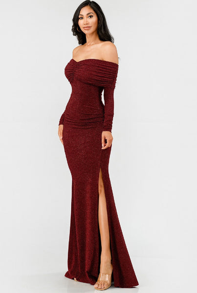 Off The Shoulder Glitter Sweetheart Neckline Ruched Gown