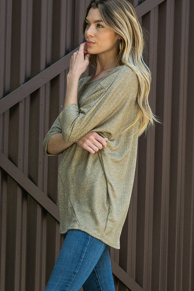 Lurex stretch rib 3/4 dolman, boat neck knit top.