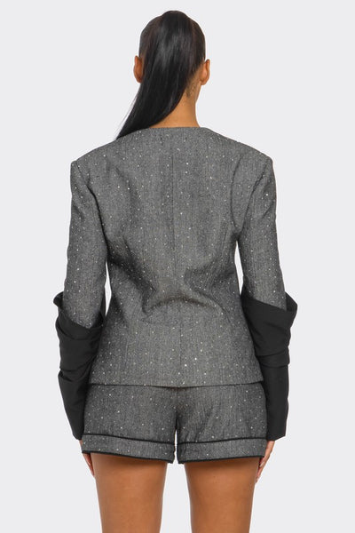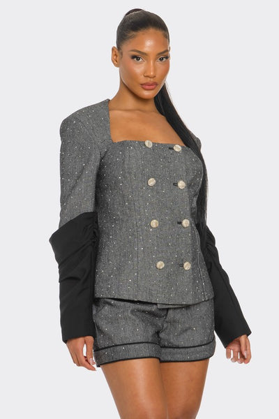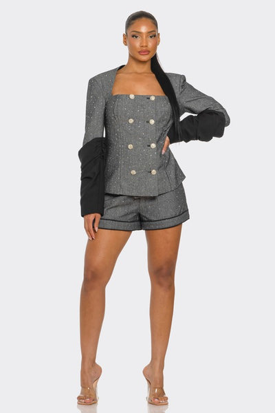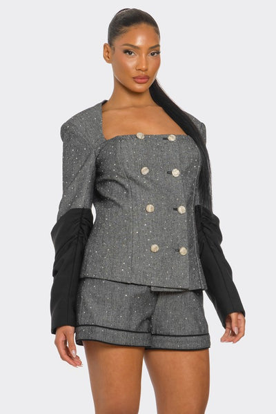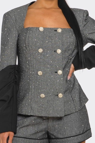 This chic and sophisticated tweed set includes a double-breasted blazer with an elegant square neckline and matching high-waisted shorts. The subtle sparkle woven into the charcoal fabric adds a touch of glamour, making this set ideal for a polished, fashion-forward look.