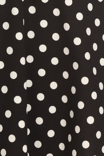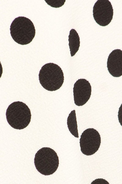 White and red polka dot, high waisted knee length skirt in a relaxed fit with an elastic waist and a-line silhouette.